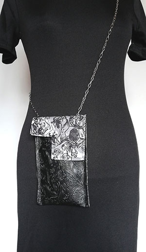 Handy-BAG Drucken IN DIE BAG statt in die Hand! Die Tasche für´s Handy - so bleiben die Hände frei und das Handy ist trotzdem griffbereit! Material: Kunstleder und Dekorstoff, Magnetverschluss und silberfarbene Gliederkette aus Metall Maße: 10x18cm Zurück Weiter