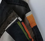 Ein gefütterte Shopper mit Außentasche und mit einem Stoffmuster, das an Motiven von Hundertwasser erinnert.