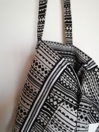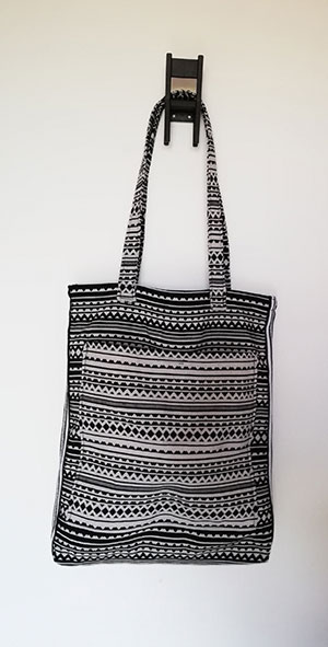 Sowie seitlich ein gestreiftes Zierband um einen Musterbruch zu erzielen und einer geräumigen großen Außentasche.