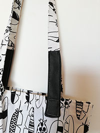 Die Tasche besteht aus zwei verschiedenen Materialien. Sattel aus schwarzem Kunstleder und der Rest aus bedruckter Baumwolle. Auch bei den Trägern wurden Details aus Kunstleder eingearbeitet.