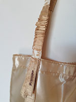 Reine Seide mit Satin kombiniert, die gerafften Schlaufen auf den Taschenträgern runden die festliche Optik ab.